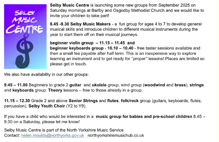 On Thursday, we had the pleasure of welcoming in the North Yorkshire Music Service this week to deliver a Music Showcase Assembly! The children were treated to performances by professional musicians who showcased a range of instruments from the families of brass, woodwind, string and percussion. They are a talented group and the children loved hearing and naming the different instruments! As a follow up, if your child is interested in finding out more about what their service provides and they would like to explore a new instrument, please find out more information further down on the newsletter. Thank you to our Music Lead, Mrs Everett for organising this.