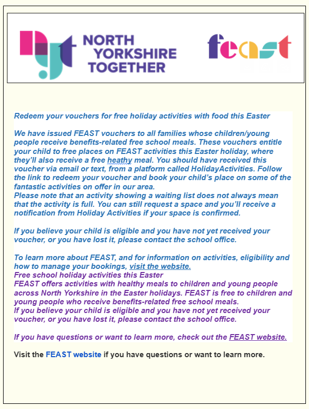 Dance Elite are also proud to be part of the FEAST programme with North Yorkshire Council, supporting children who are eligible for benefits-related free school meals. This allows funded places for qualifying families, helping ensure children can access enriching holiday activities.
